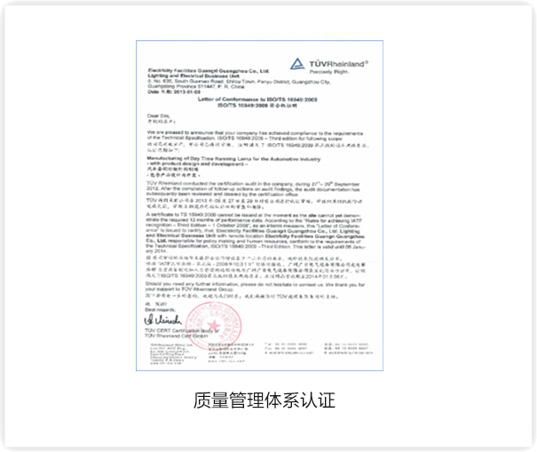 2015年通過IS09001質(zhì)量認證,TS16949等體系認證,代表著公司已步入規(guī)范化,標準化,科學(xué)化的現(xiàn)代企業(yè)管理軌道,進一步的保障了工程質(zhì)量,促進公司的快速發(fā)展。